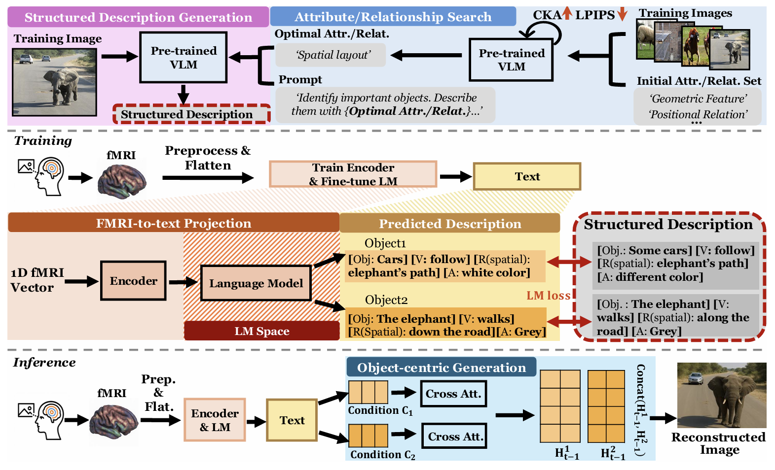 Demonstrates that fMRI signals align better with structured text representations than vision model representation; and proposes PRISM, a text-based framework that improves fmri-to-image reconstruction via object-centric diffusion.