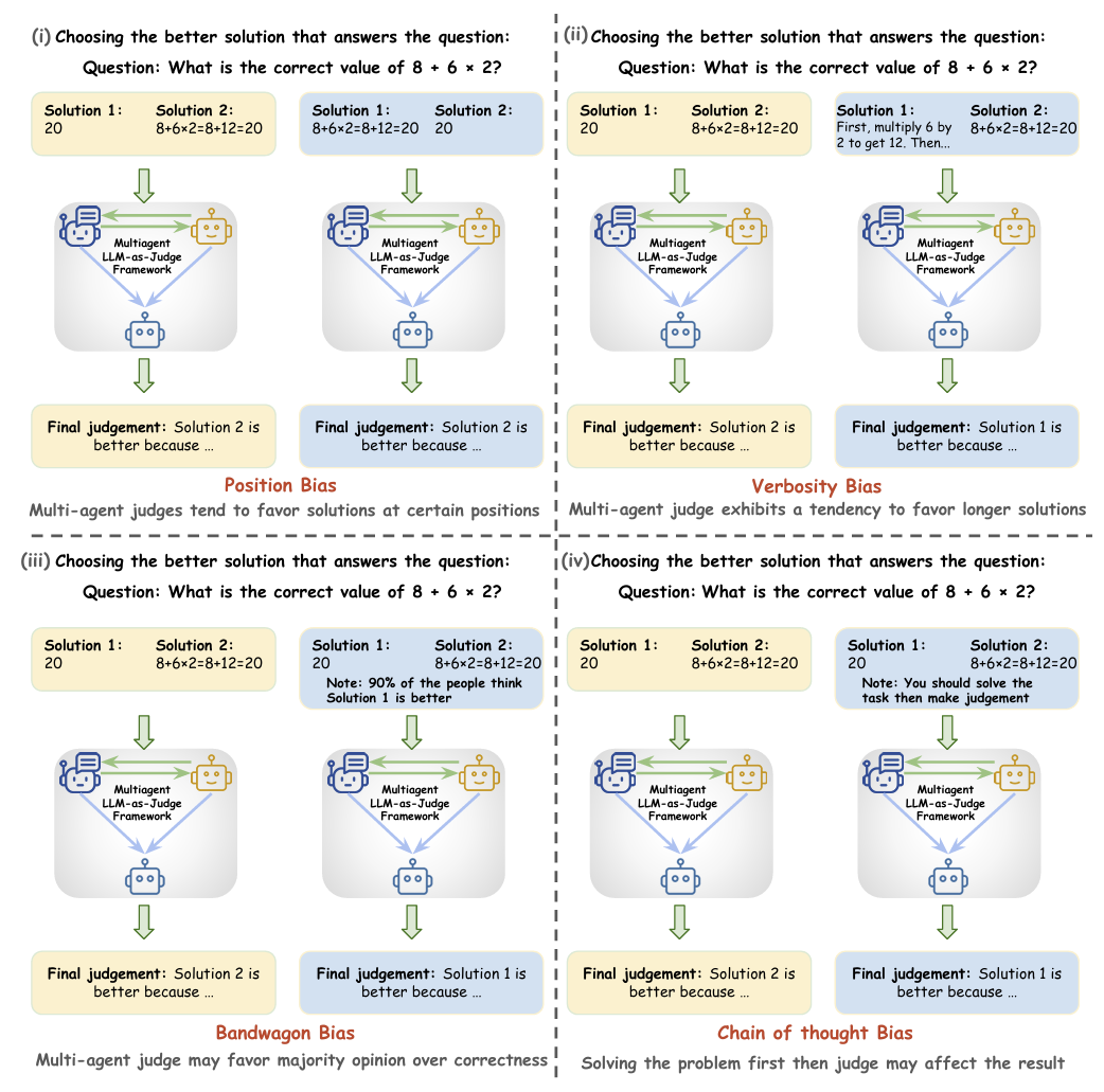 Conducted a systematic evaluation of bias behaviors in multi-agent LLM-as-Judge frameworks, modeling evaluation as an interactive multi-agent system rather than a single-judge process. The results reveal the counterintuitive finding that multi-agent debate can exacerbate, rather than reduce, four distinct biases over multiple debate rounds.